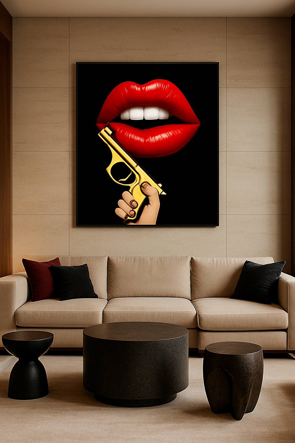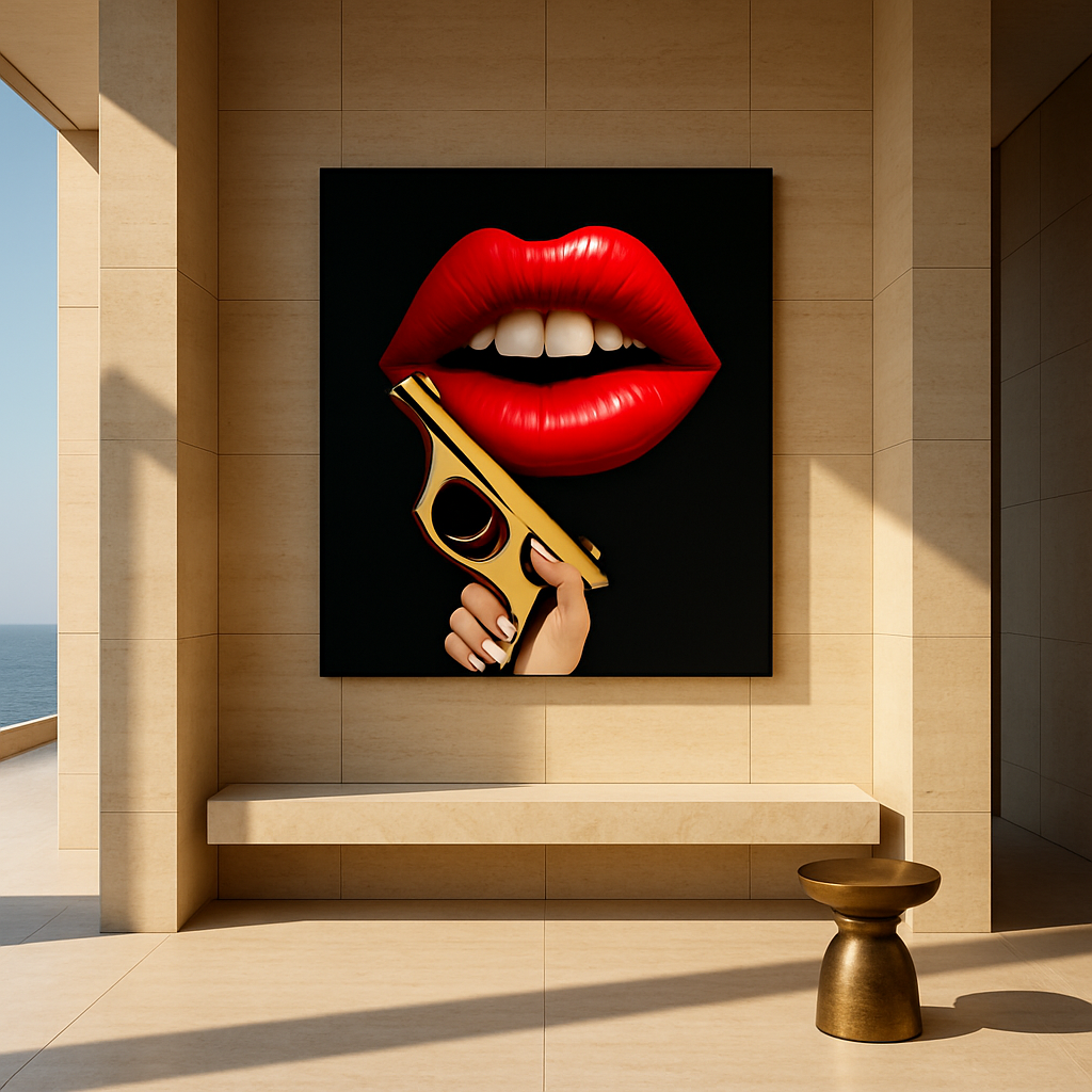 Provocative artwork maintains strong appeal among confident collectors. Designed for spaces where art leads the conversation—penthouses, private offices, gallery-forward residences, and bold modern interiors.