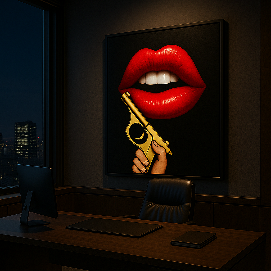 Glossed scarlet lips hover in a moment of suspended tension—desire sharpened, danger intimate, power held with deliberate restraint. The composition balances seduction and threat with razor precision, forcing the viewer into a quiet confrontation where beauty and authority coexist.