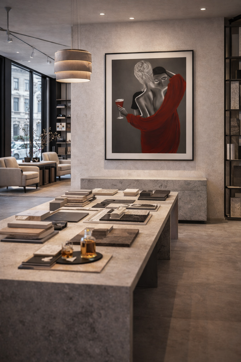 The figures are faceless yet unmistakably human. Their closeness speaks of trust rather than exposure. The glass of red wine becomes a quiet witness—celebration deferred, tension sustained.