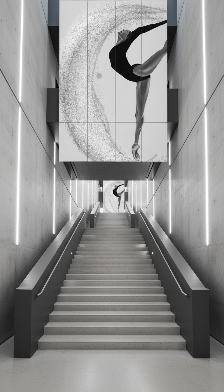 Suspended mid-arc, the dancer forms a near-mythic silhouette—body extended beyond gravity, balanced between restraint and release. A sweeping arc of texture curves around the figure like a cosmic wind, evoking time, breath, and momentum. The palette is restrained—soft stone, charcoal, and shadow—allowing form to dominate with quiet authority.