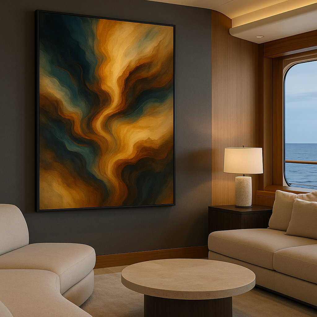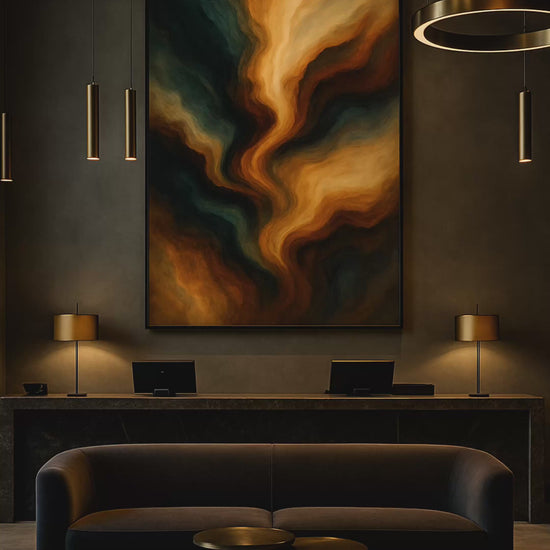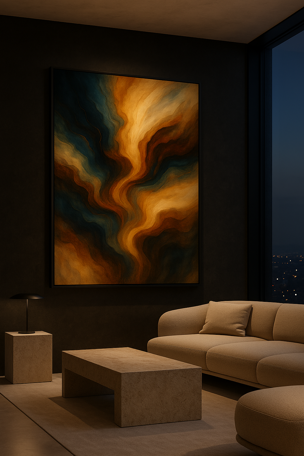 The vertical movement draws the eye upward, reinforcing ambition and legacy. The palette references wealth without excess—gold without polish, depth without darkness. It is architectural art, designed to harmonize with leather, walnut, stone, and shadow.
