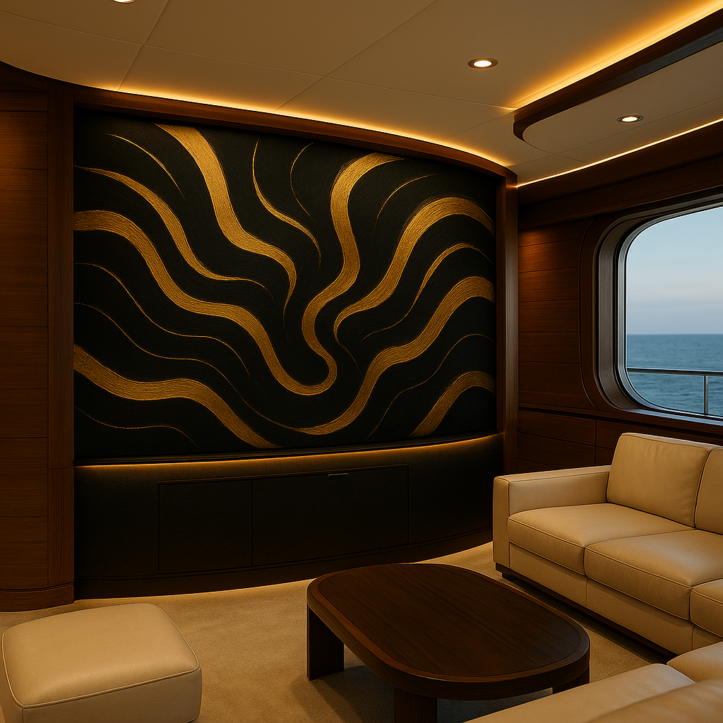 A sculptural black-and-gold abstract created for luxury galleries, penthouses, and boutique hotels—balancing movement, geometry, and architectural serenity.