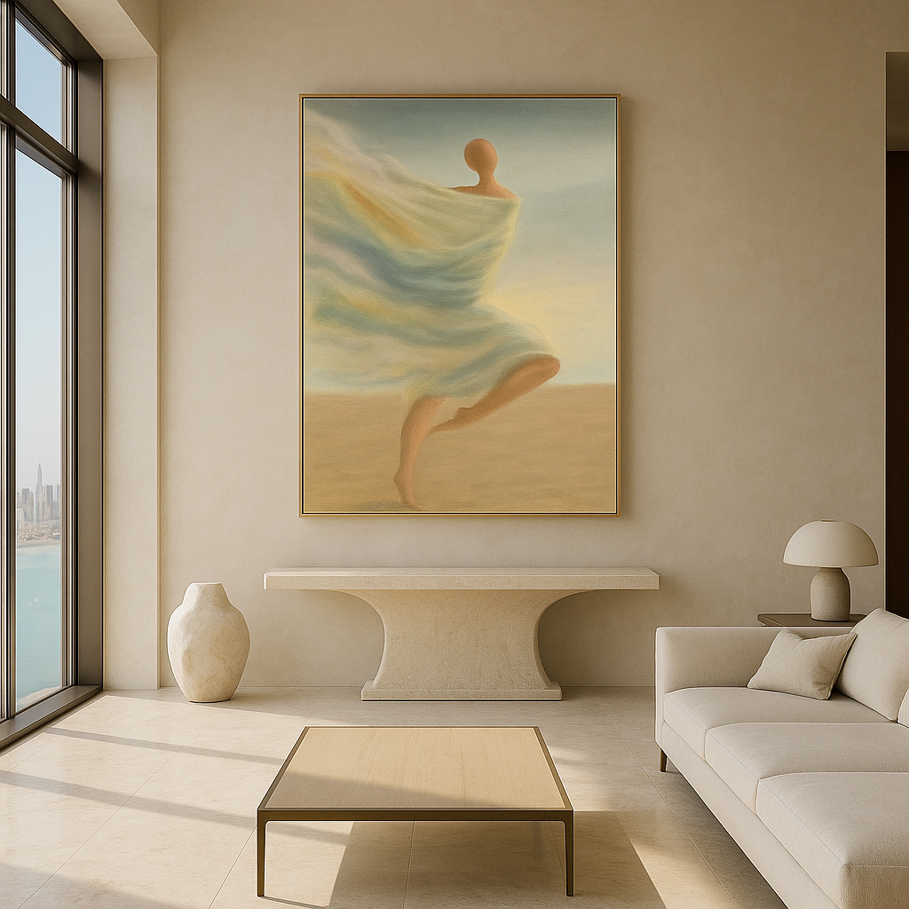 Rendered in muted sand, sky-washed blue, and warm alabaster tones, the composition evokes ancient frescoes, coastal silence, and the quiet intimacy of dawn. The figure's motion suggests freedom without urgency—grace without performance.