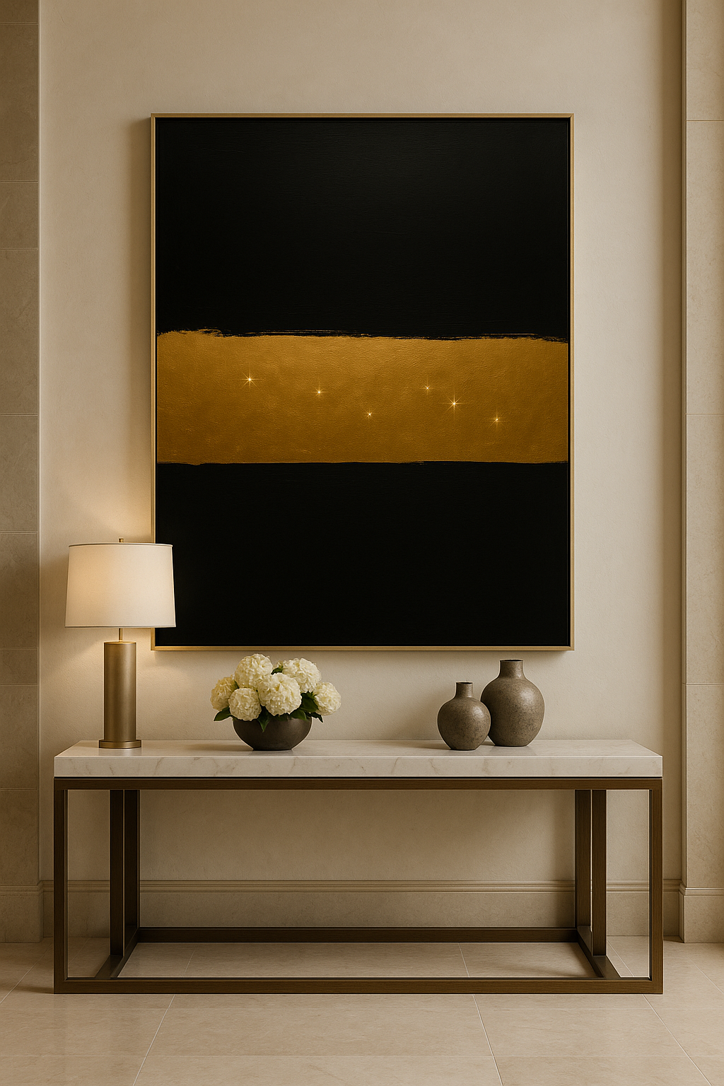 The velvety black upper field evokes a moonless sky; the gold below mirrors the soft shimmer of lights reflecting over water. Together, they create a tranquil horizon—an invitation to rest, unwind, and disappear into stillness.