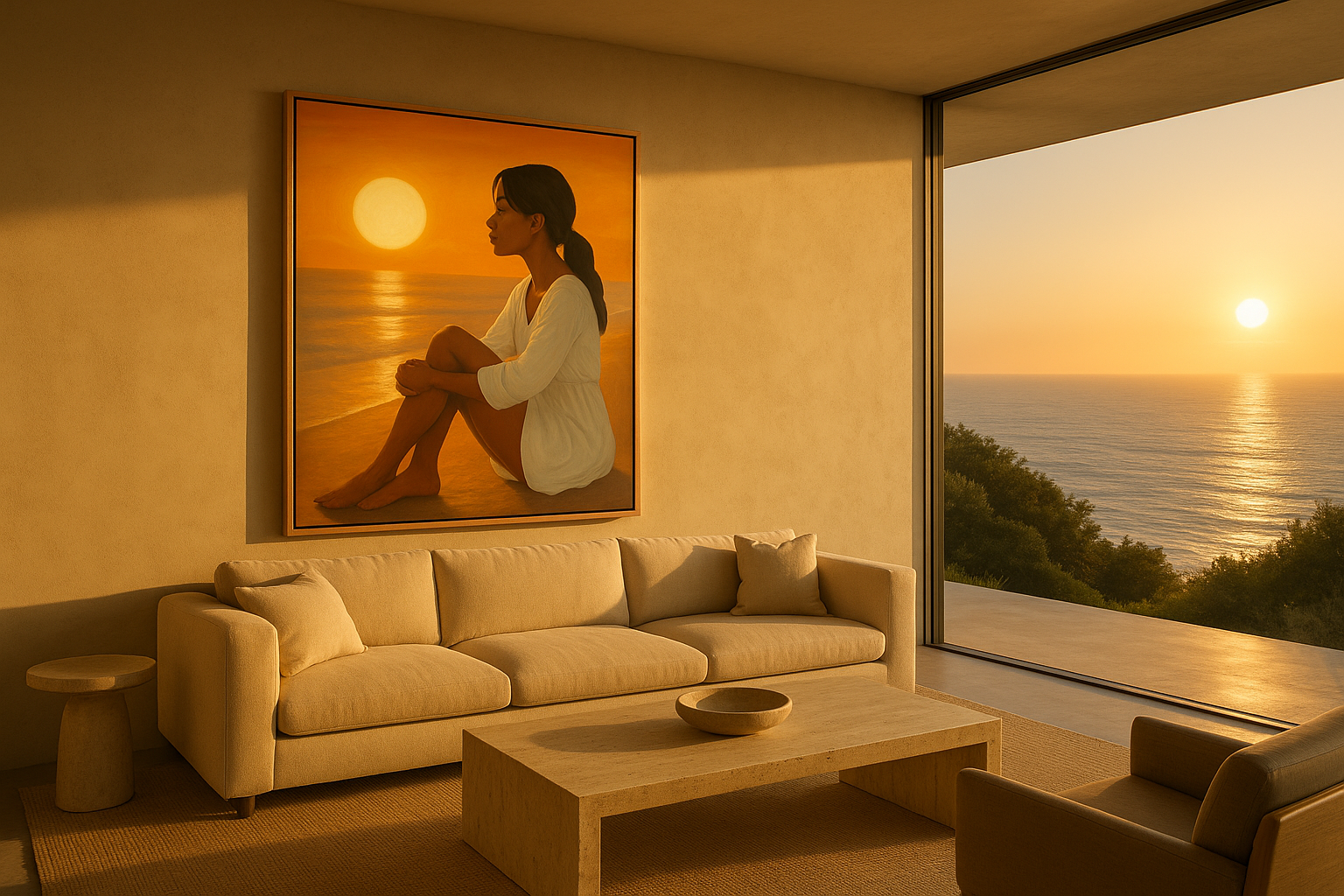 Seated in gentle contemplation, the figure gazes toward a glowing horizon where sun meets sea. Wrapped in amber light, her posture suggests peace rather than anticipation. There is no urgency here—only presence. The surrounding palette of honeyed golds, sand neutrals, and sun-warmed linen transforms the space into an immersive moment of serenity.