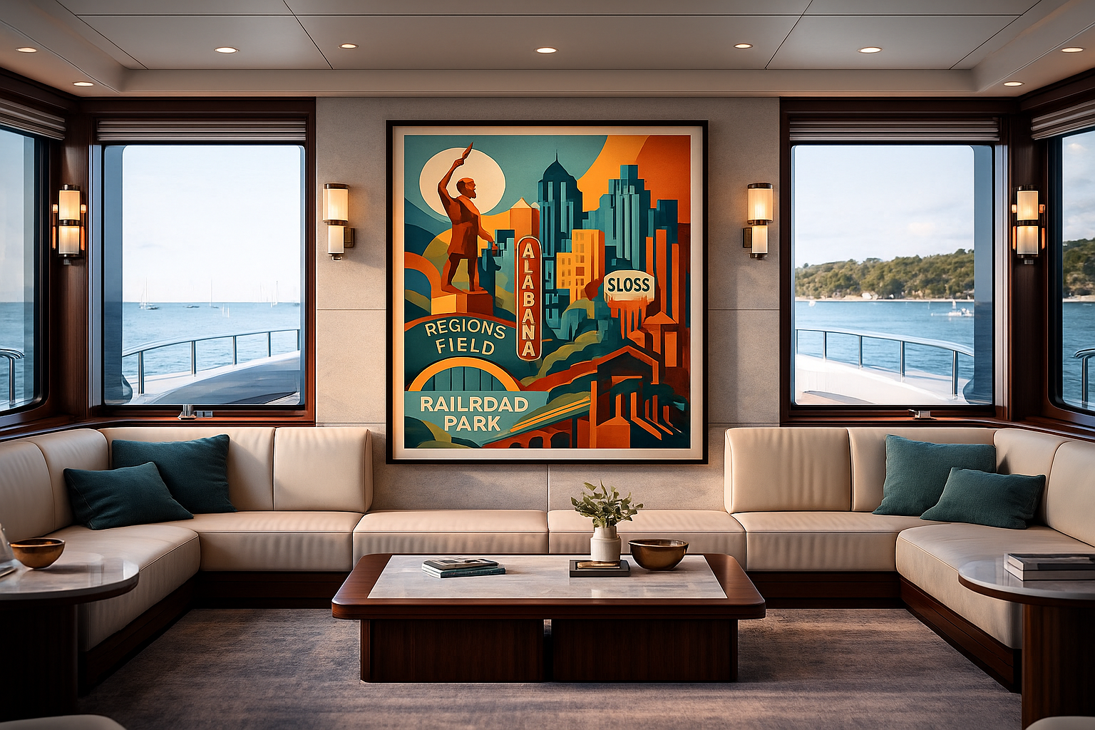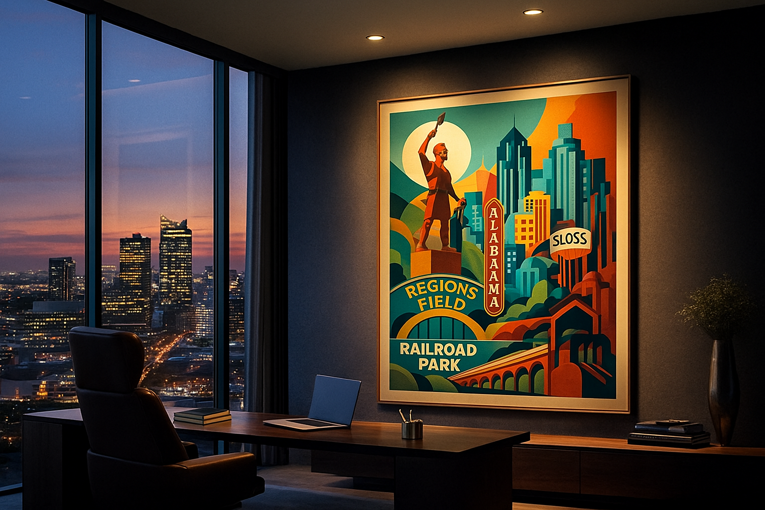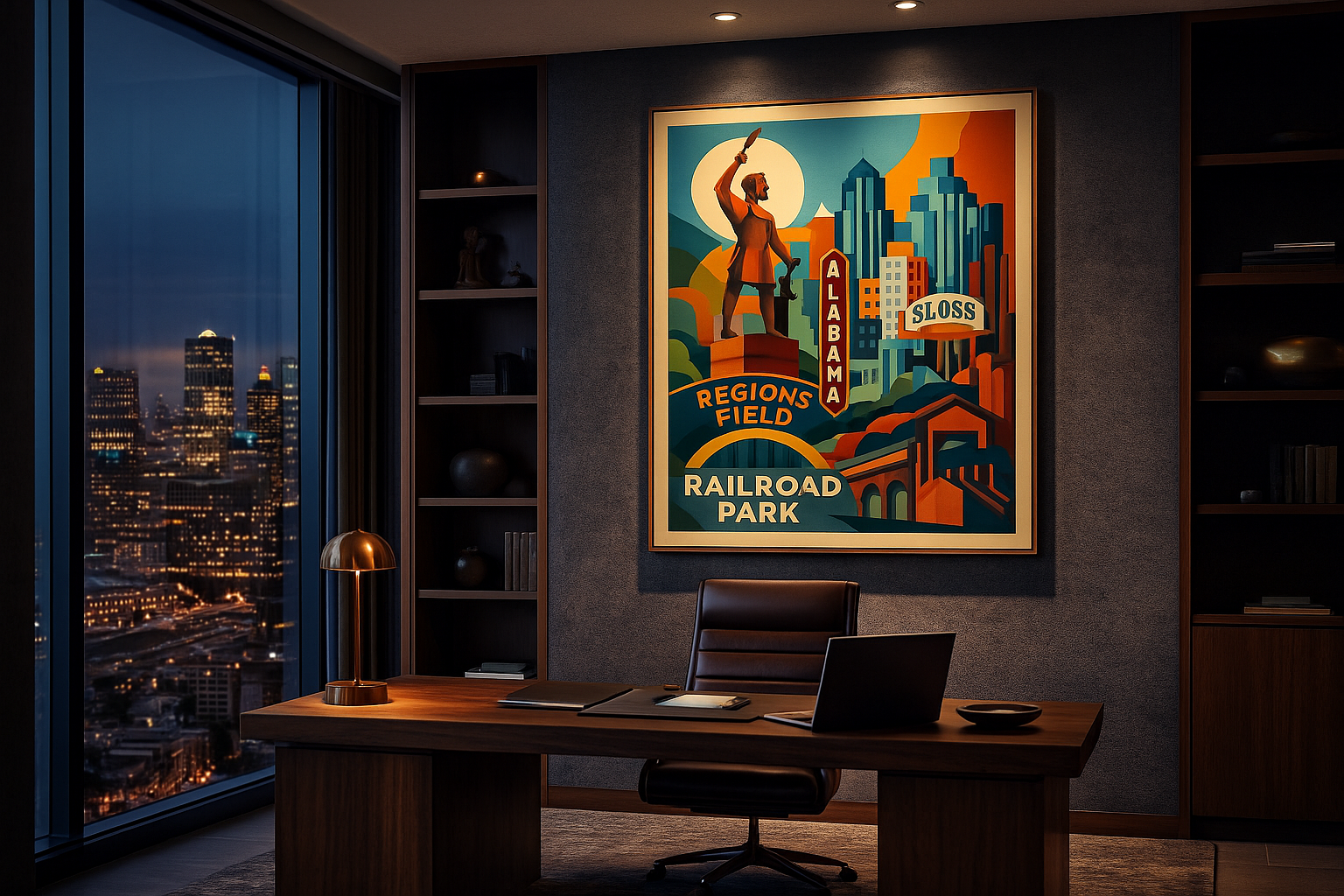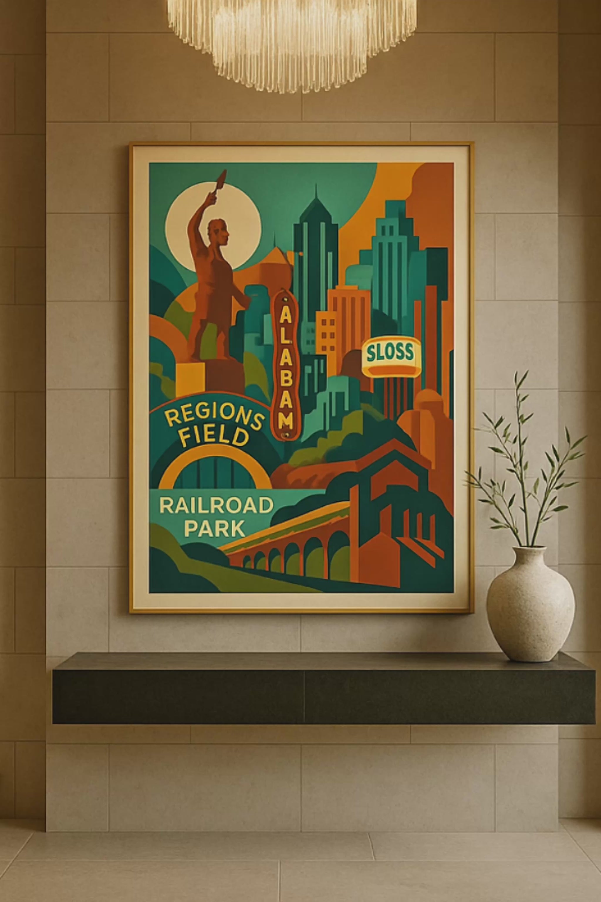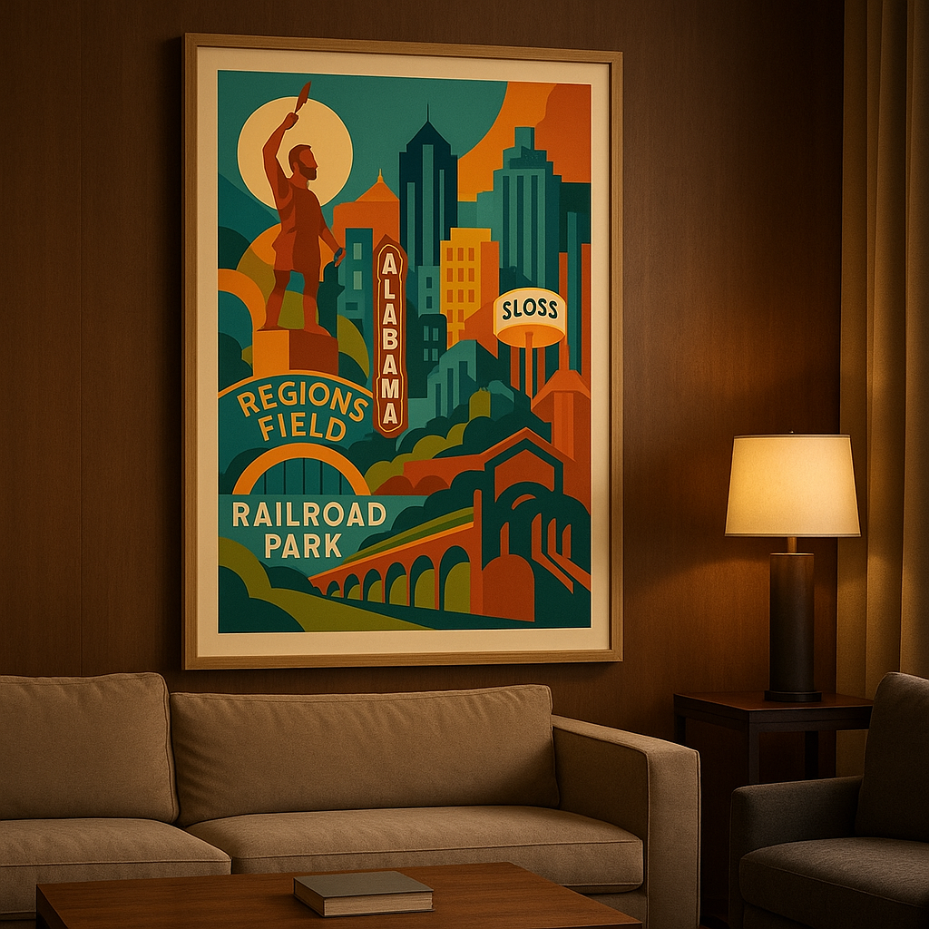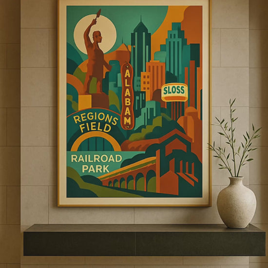 Rendered in a refined Art-Deco–inspired style, this composition elevates iconic landmarks—Regions Field, Railroad Park, Sloss Furnaces—into a timeless architectural narrative. Strong geometric forms and saturated earth tones echo the city's steel legacy, while soft curves and celestial elements introduce harmony, optimism, and renewal.