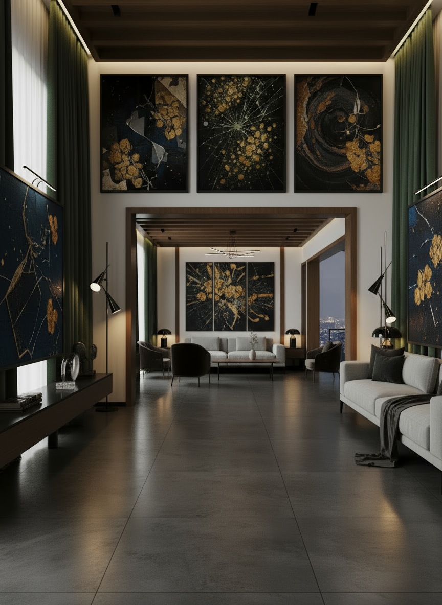 Indulge in this 24x36” luxury abstract masterpiece featuring shimmering gold foil specks over a deep black canvas with a striking broken glass effect. Perfect for high-end collectors, luxury interiors, and gallery-level home décor.