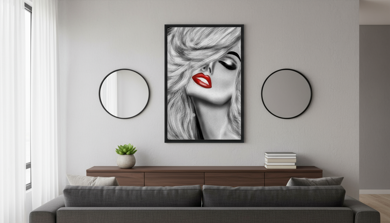 This piece captures the essence of a woman who says nothing yet speaks everything. The crimson lips — vivid, defiant, alive — stand in radiant contrast to the grayscale calm surrounding her. She is both muse and mystery, a modern echo of timeless femininity.