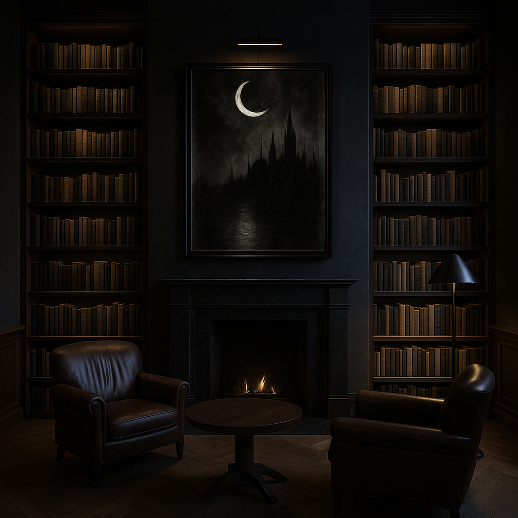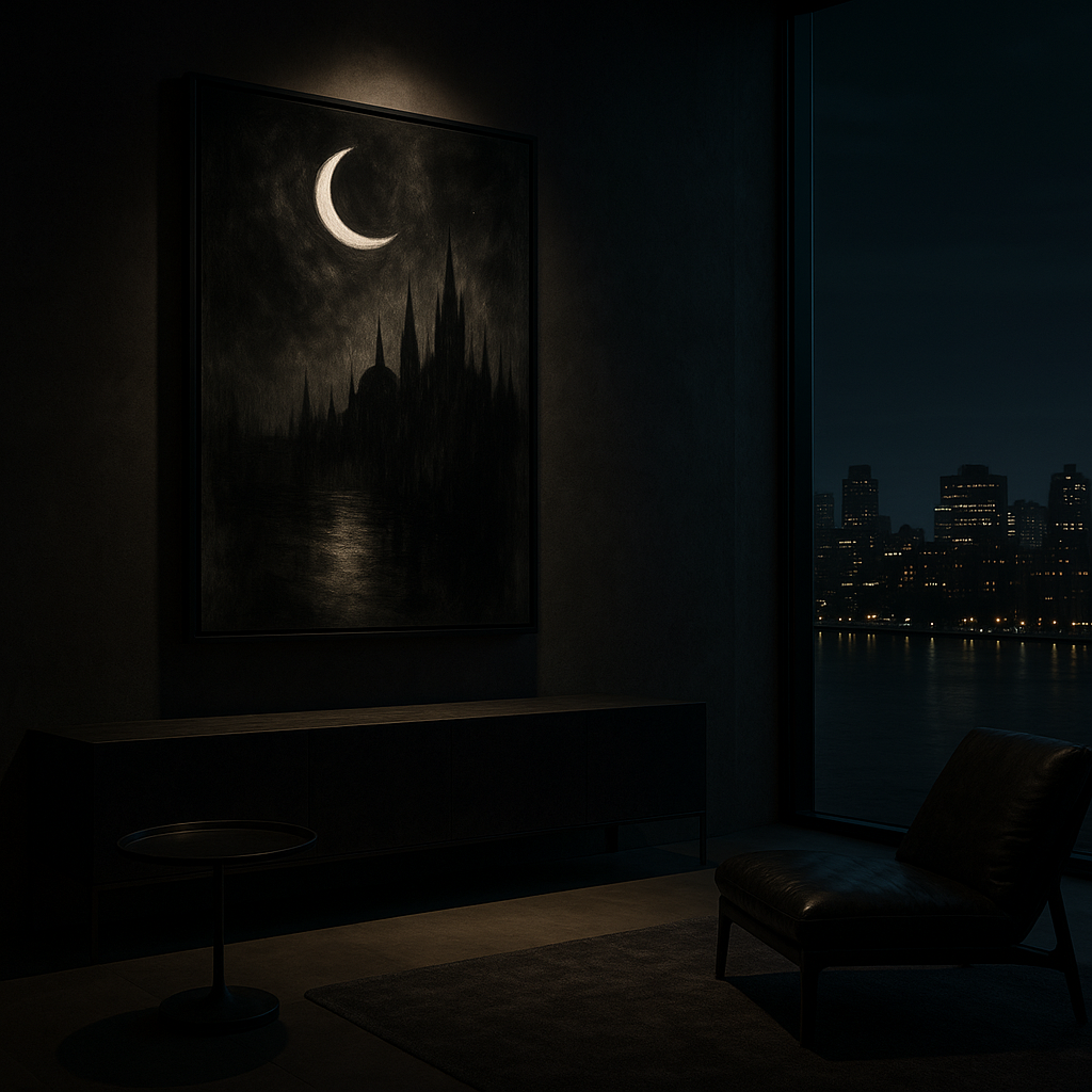 The composition speaks to collectors who understand quiet intensity—those drawn to works that shape mood rather than explain themselves. The grayscale depth, softened edges, and painterly texture evoke old-world nocturnes with a modern severity.