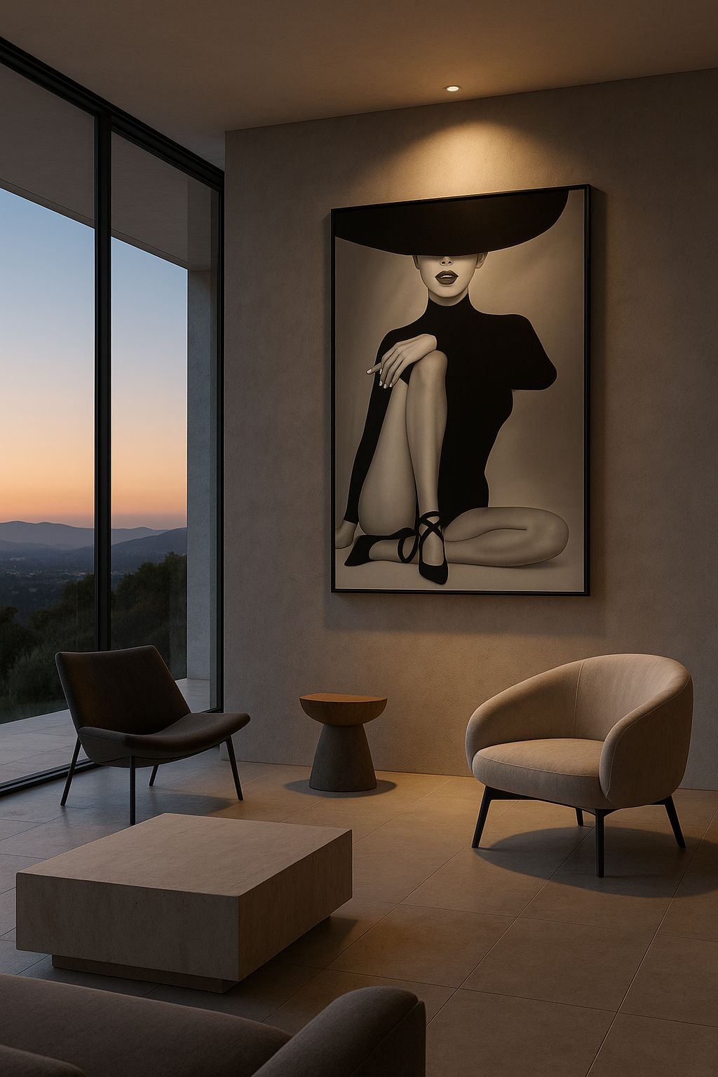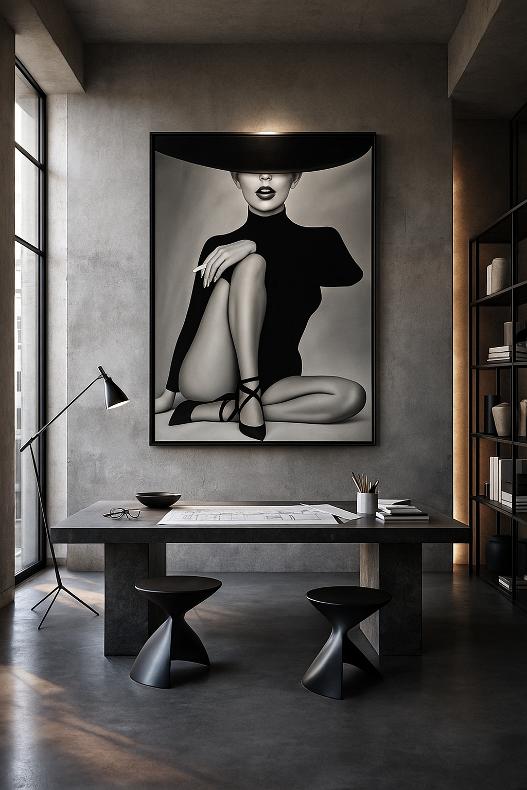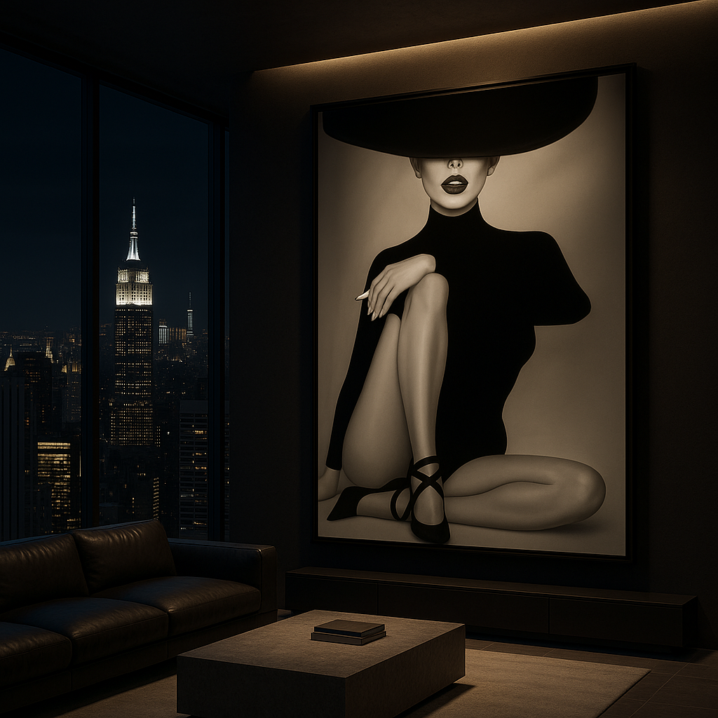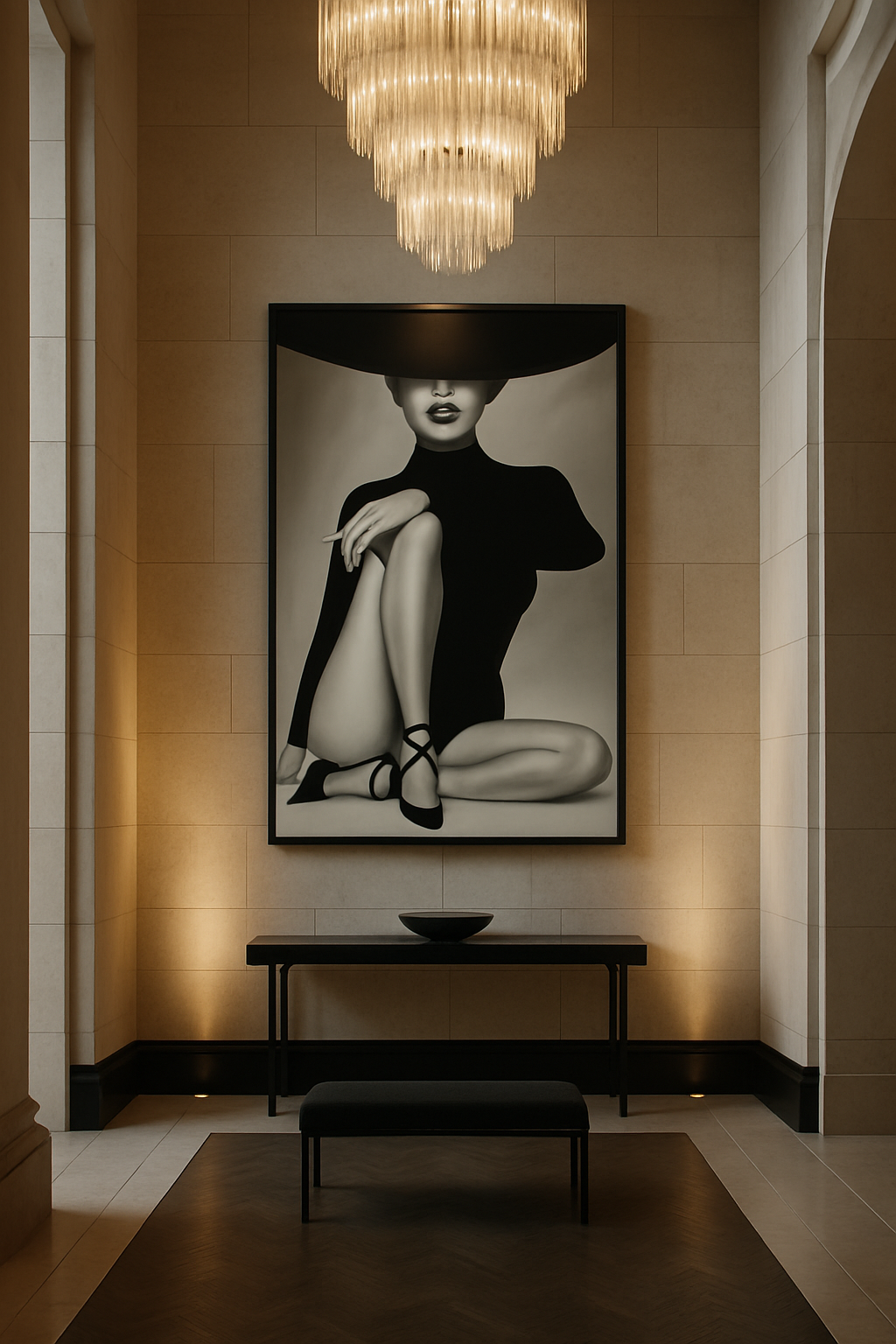 Figurative noir artwork maintains strong demand among sophisticated collectors. Designed for spaces that understand luxury beyond trend—penthouses, boutique hotels, executive offices, and private galleries.