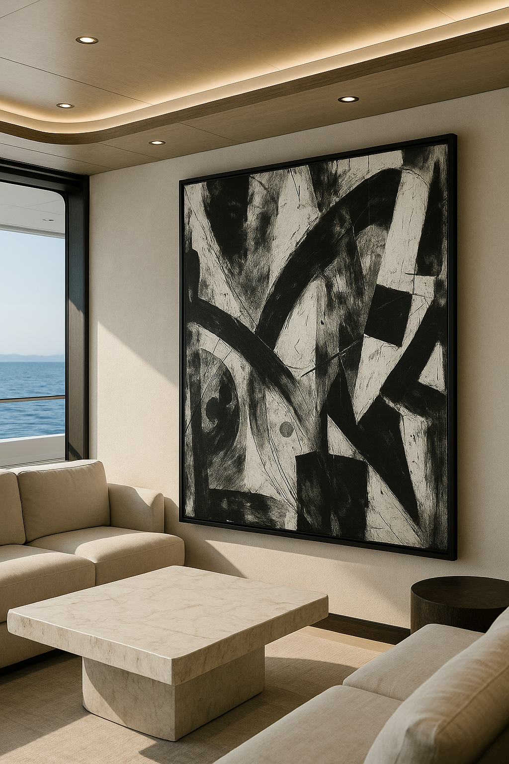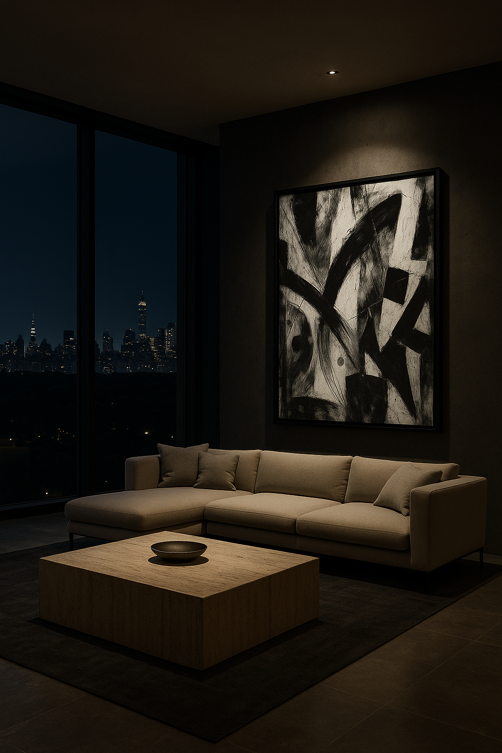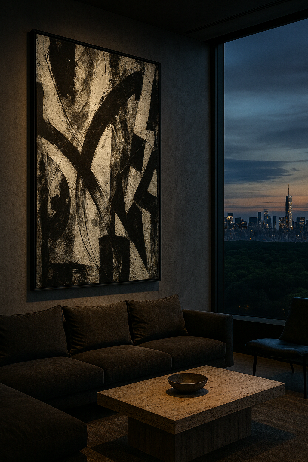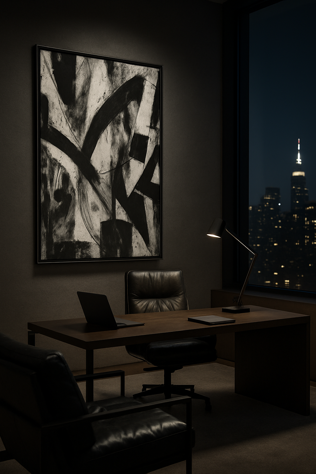 Rendered in deep black, stone ivory, and textured graphite, the composition feels architectural and emotional at once. It belongs in spaces where clarity, authority, and quiet dominance matter—executive lounges, penthouse living rooms, boutique hotel libraries, gallery stairwells.