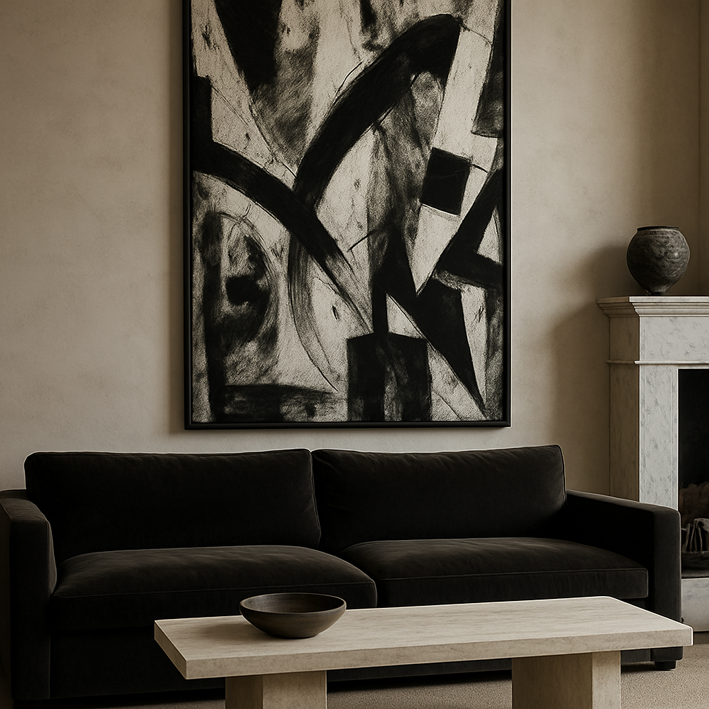 This monochrome abstract commands space through force and balance—bold charcoal arcs, fractured geometry, and gestural strokes that feel both deliberate and instinctive. The contrast between soft erosion and sharp interruption evokes power under control: a visual heartbeat restrained by design.