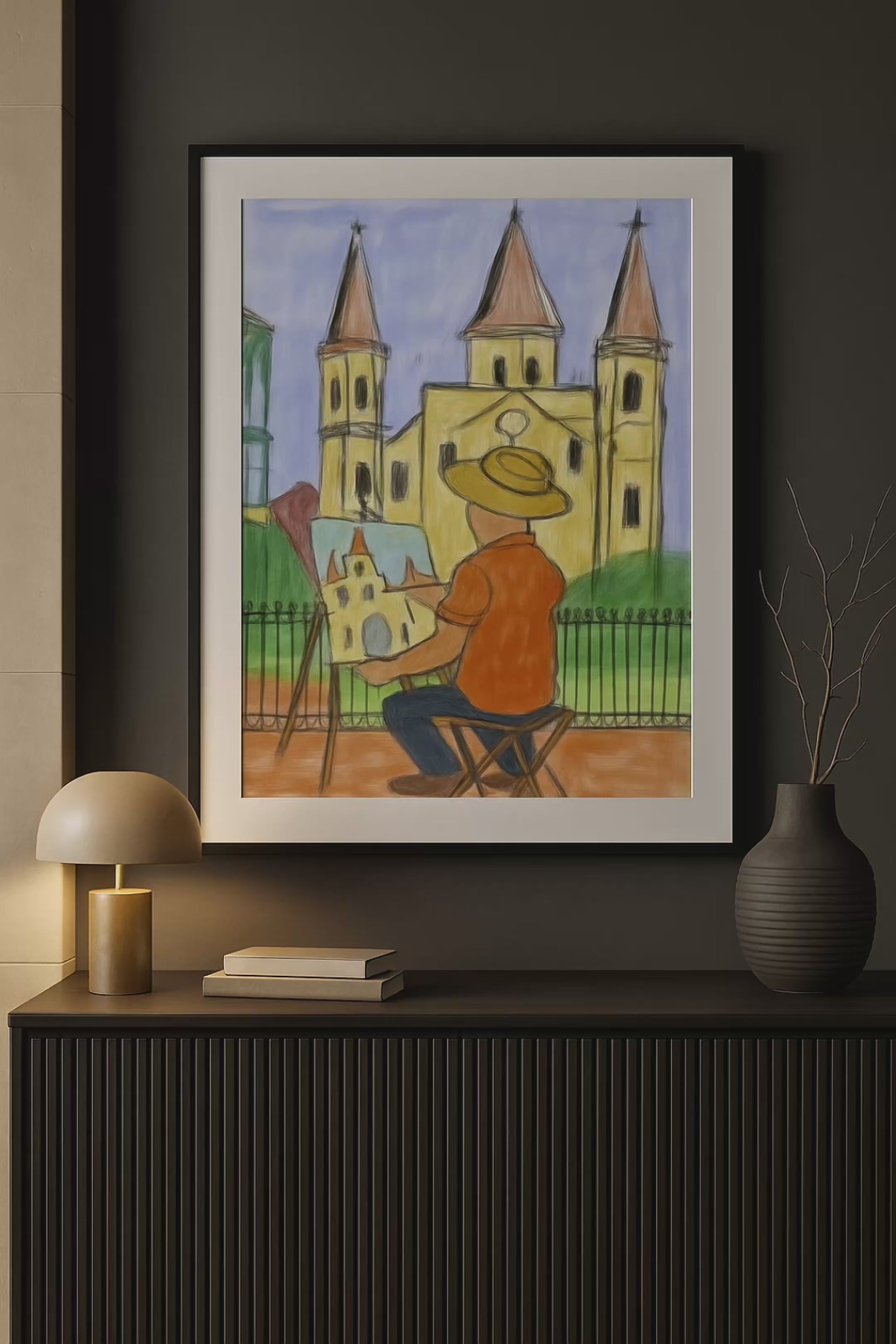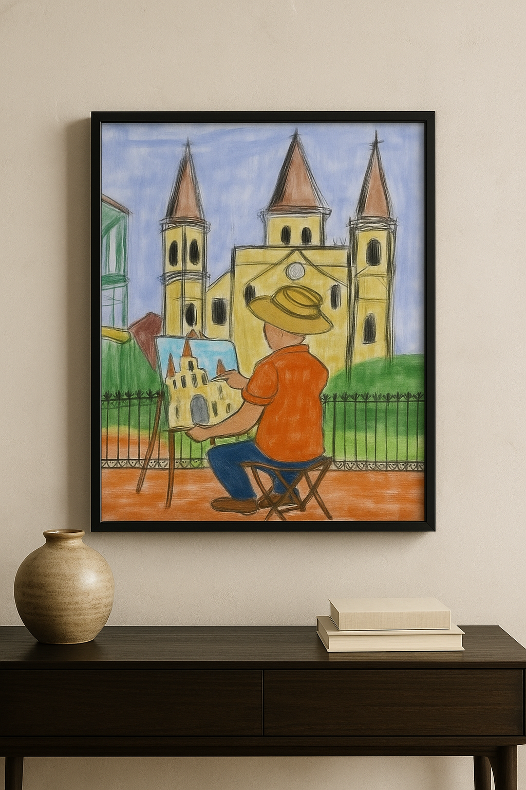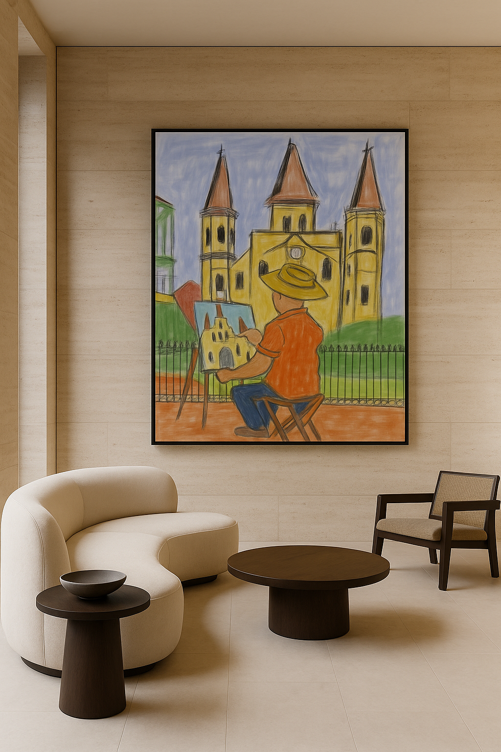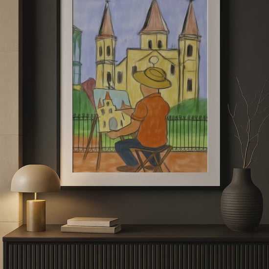 Rendered with naïve warmth and intentional restraint, this piece carries the soul of European courtyards, plein-air tradition, and lived artistry. The palette—ochre, weathered yellow, muted green, sky blue, and worn terracotta—recalls historic town squares and artists who painted not for applause, but for truth.